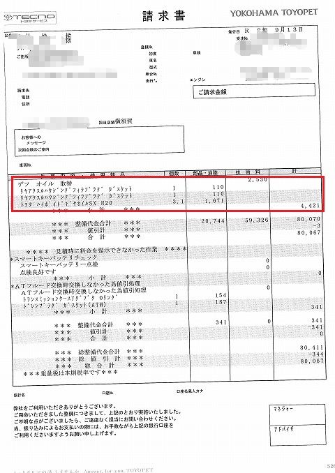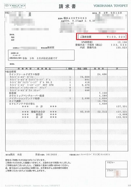 請求書 もらって嬉しい人は、まず居ない請求書。 まずは、フロント ウィンドウの交換・修理分から。 13万円超。 (O_O) 「値上がりしたなぁ〜。 ちなみに、ハイエースのフロント ウィンドウを交換するのは3回目。 全部、高速道路上での飛び石。 周りの人間には、「前のクルマに車間を取らず、ピッタリ張り付いて走っているんだろう。」 と言われますが、その逆。 自分、クルマの運転はアクセルやらブレーキをやたらと調整したくないので、車間は結構取る方だと思ってます。 逆に自分くらい車間をある程度開けた方が、飛び石が高く上がるのかも・・・。 そりゃわからんが、交換の費用が高くなった一因は、カメラシステム。 最近のクルマはフロントグラスの上の所に、追突防止やレーン キープのためのカメラが付いているでしょ。 あのカメラは、フロント グラスを交換した後に調整しないとダメらしい。 カメラ調整とか、ナビゲーション アンテナ取替とかETCアンテナ付け替えとか、以前だったら無いような内容で2万円以上請求されてます。 当然、嬉しくはないけど、仕様が無いよね。 直さないと、車検通らないから。 |