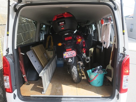 9月13日(日) 引取り 午後、車検&修理が完了した連絡をもらって、ハイエースを引上げにきました。 今回ももちろん、GROM でね。 |