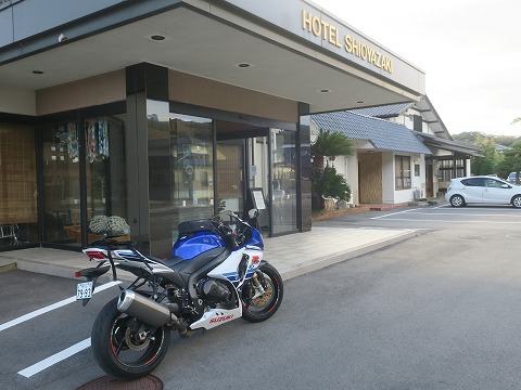 9:30 出発 勤労感謝の日ツーリング、 今回のツーリングは1泊2日です。 ホテルの前で一人こっそりと写真を撮ったら、2日目帰路につきます。 |