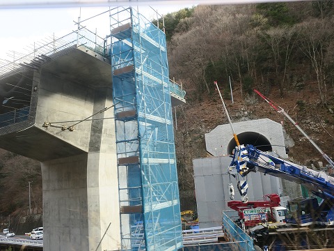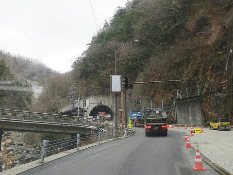 9:12 バイパス トンネルを 国道158号線が狭隘な区間が多いにもかかわらず、拡幅工事が進まないと思われる理由のひとつは、並行して走る中部縦貫自動車道を整備する計画があるから、とか。 すぐ脇を立派な道路(中部縦貫道)を建設するのに、現道(国道158号線)の拡幅工事になんて、お金を使えませんぜ。 みたいな。 なので、現道の国道158号線は狭いくて急カーブが連続する道路のまま、遅々として改良は進んでいません。 と、思ったら頭上でトンネル、橋梁の建設中。 途中に何本かある大型車が離合できない狭いトンネルをバイパスする形でトンネルを建設中でした。 しかし、凄い場所にトンネルの入口を作るもんだ。 |