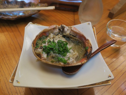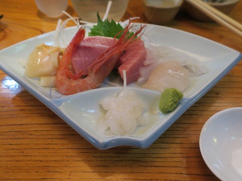 17:38 刺し盛り 日本酒を飲もうとしたら、ちょうど刺身の盛り合わせが供されました。 盛り合わせは、手前が白エビ、左からバイガイ、甘エビ、マグロの大トロ、ブリにイカが載っています。 白エビの生は、超淡白な味わいで、北陸ならではの味覚。 バイ貝はコリッコリの食感で美味しいです。 マグロも良いのを置いてありますが、やっぱり地元のブリは美味しい。 |