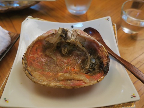 18:36 甲羅焼き カニの足を食べ頃合いを見計らって、甲羅は焼きにして供されます。 甲羅焼きは、カニの身にカニみそを和えて甲羅ごと焼いてあります。 これも、言わずもがな美味い。 足がウマけりゃ、身も美味い。 |