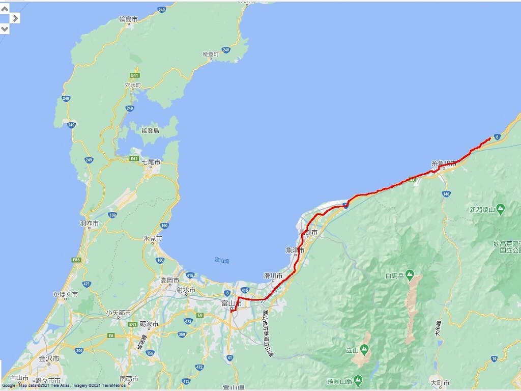 途中の道程: 富山市 → 糸魚川 → 能生:115.76km |