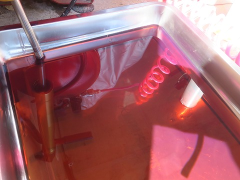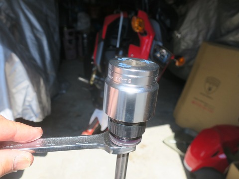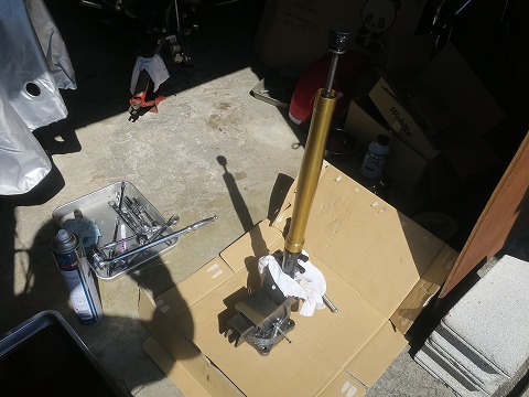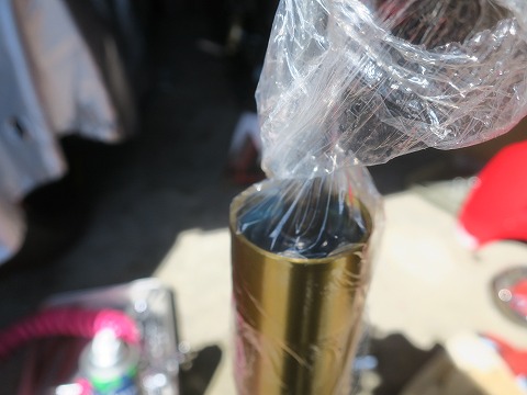 11:41 一旦中断 片側のフォークが終わったので、もう反対側も。 と思ったんですが、昼食の時間が近くなったので、片側だけでまた作業を中断。 日曜大工じゃなくて、”日曜整備”なんでね、家のスケジュールが優先です。(笑) オイルを充填したフォークは、ゴミが入らないようにラップをして、エアー抜きを兼ねて、放置しておきます。 絶対に倒さないように、注意ですね。 続きは、午後です。 (つづく) |