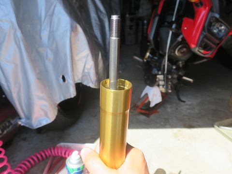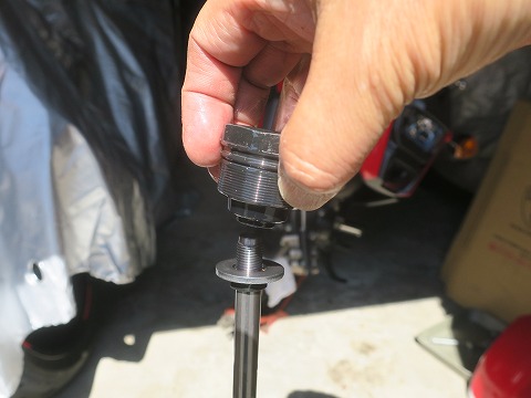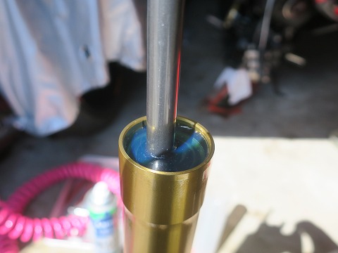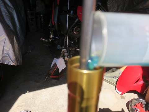 11:38 全量入れる 220cc、全量入りました。 オイルの中に気泡がたくさん入ってます。 (◎_◎;) まっさらな新品に規定量を全部入れたら、オイルはアウターチューブから75oの位置になるのが正解。 ですが、今オイルは、アウターチューブのギリギリまであるので、その分は今まで入っていたオイルの残留分でしょう。 自分の持っているCBR600とかGSX-Rの場合、スプリングが取れるので、スプリングを抜いた状態でオイルレベルを調整します。 でも、GROMの場合、スプリングが一体になっていて取れないので、スプリングが入った状態で、オイルレベル 75o。 フォークスプリングって、オイルが結構付着して残ったままなんですよね。 |