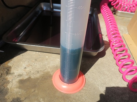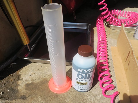 11:28 計量 それでは、開封して。 メスシリンダーに計量します。 フォーク片側あたり、約220ccの容量だそうで。 ボトルが600ccなので、1本でフォーク2本分足ります。 リーズナブルです。 |