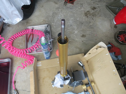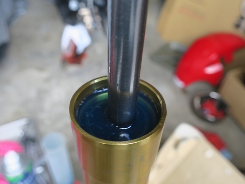 12:54 気泡が抜けてる 昼食を食べて、ガレージに戻ってきました。 GROMのフォークオイルの交換作業、続けます。 備忘録です。 さて、新しくオイルを充填した方のフォークを覗いてみると、気泡が抜けてます。 オイルの高さはほとんど変わってないけど。 もう一本のフォークもオイルを入れちゃいましょう。 |