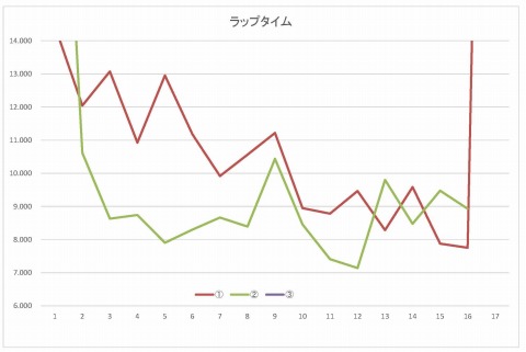 と言うことで、12週目に本日のベスト7秒1、16周回して2本目の走行は終了です。