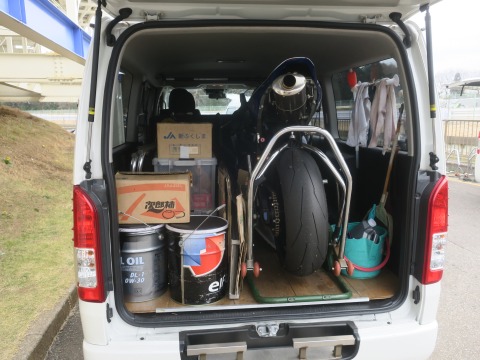 タイヤウォーマーとか、発電機とか、最小のスペアぱーつとか、とかとか、そこそこの荷物です。(笑)