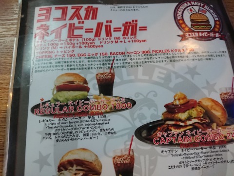 12:17 注文は定番 15分ほど待って、店内に通されました。 席はカウンター。 4人がけのテーブル席もありますが、2人なので。 早速注文するなり。 まずは定番のネイビーバーガーでしょうね。 コンボ(セット)があったので、それを注文。(税抜き 1,800円)) コンボは、ネイビーバーガーとフライド ポテト、飲物がセットになっています。 訪れるお客さんのほとんどが、これをチョイスしているようです。 |
