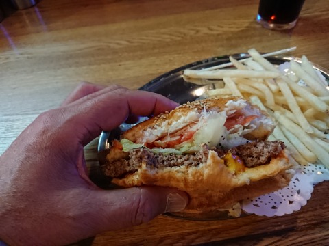 12:42 味変 パティの味付けは、基本の塩・コショウだけ。(たぶん) テーブルの上に、ケチャップとマスタードが置いてあるので、お好みで。 自分も半分くらい食べたところで、ケチャップとマスタードで味変。 上からかけると、レタスの上にかかって食べにくそうなので、食べやすいようにひっくり返して、バンズとパティの間に塗り付けます。 後でネットで他の記事を見ていたらと、ひっくり返してケチャップとかをかけるのは、通ぶった食べ方です。って書いてあった。 それをやってしまった。 カッコ悪〜っ。(笑) |