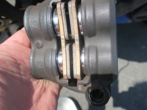 14:05 キャリパーを水洗い 新品のパッドに交換する → 新品のパッドは厚い → キャリパーのピストンを押し込まないとダメ → ピストンに付いた汚れまで一緒に押し込む。 と言う、図式ができあがるので、ピストンを押し込む前に、キャリパーを水洗い。 きれいになりました。 春の日差しを浴びて、ピカピカ。 これで心置きなく、ピストンを押し込むことができます。(笑) |