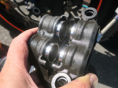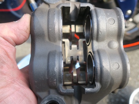 13:58 それほど? キャリパーを外しました。 ピストンはそんなに汚れてないですね。 ピストンは去年の8月にクリーニングしてました。 その後に、エビスサーキットの走行会と筑波サーキットを6本走っています。 まあ、距離にしたら大した距離じゃないですけど。 雨の中も走ってないし。 早速、キャリパーからパッドを取り外します。 |