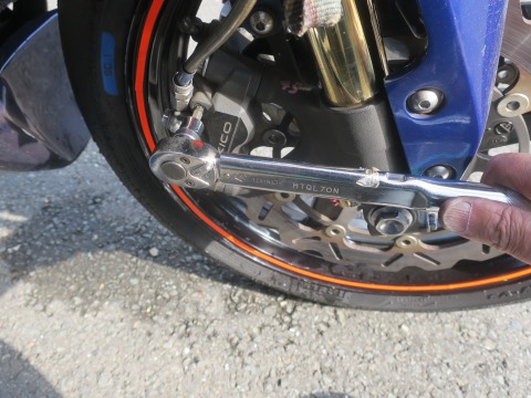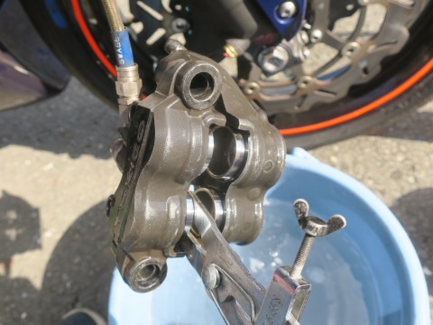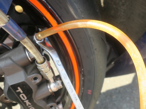 15:02 フルードを抜く キャリパーのドレンボルトから、古いブレーキ フルードを抜いていきます。 右手でブレーキレバーをにぎにぎしながら、左手でドレンボルトを緩めたり、閉めたり。 一人でやると、手がつりそう。(笑) |
