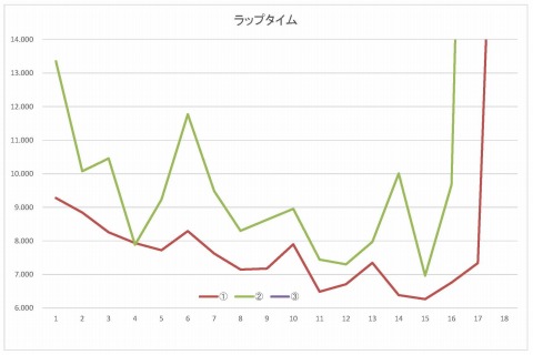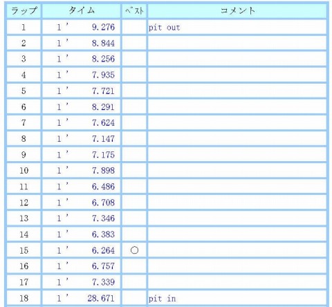 前回の走行と比較するために、グラフを重ねてみました。 緑が前回、茶色が今回。 明らかに今回の方が速いペースで走れていることがわかります。 でも、傾向も一緒なのが、笑っちゃいますよね。 走り始めから、じわじわ試しながらペースを上げていく走りです。 上手い人だと、パターンは逆。 最初の3周目くらいでベストタイムを出して、後はタイヤのグリップが落ちていくのにしたがって、タイムも落ちていくみたいな。 タイヤのグリップを感じて走っているライダーは、そうなるみたい。 自分には、無理。(笑) |