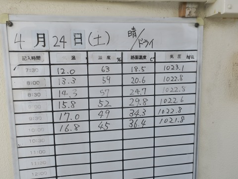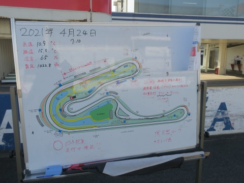 10:27 今日のコンディション 腕章を返却したら、コースインゲート脇のコンディション ボードを確認。 今日の走行9:15〜9:35のコンディションは、気温が17.0℃、路面温度は 34.3℃。 路面温度は、もう30℃以上あるんですね。 |