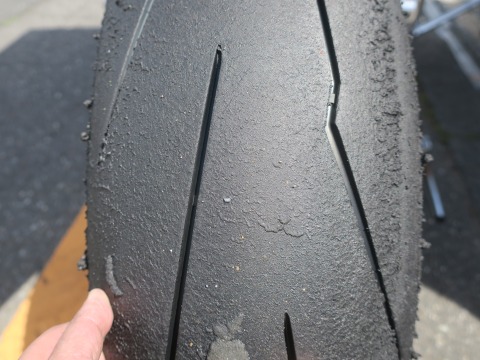 9:52 走行後のタイヤ 少しサーキット走行をしたっぽいタイヤになってきましたね。(笑) |