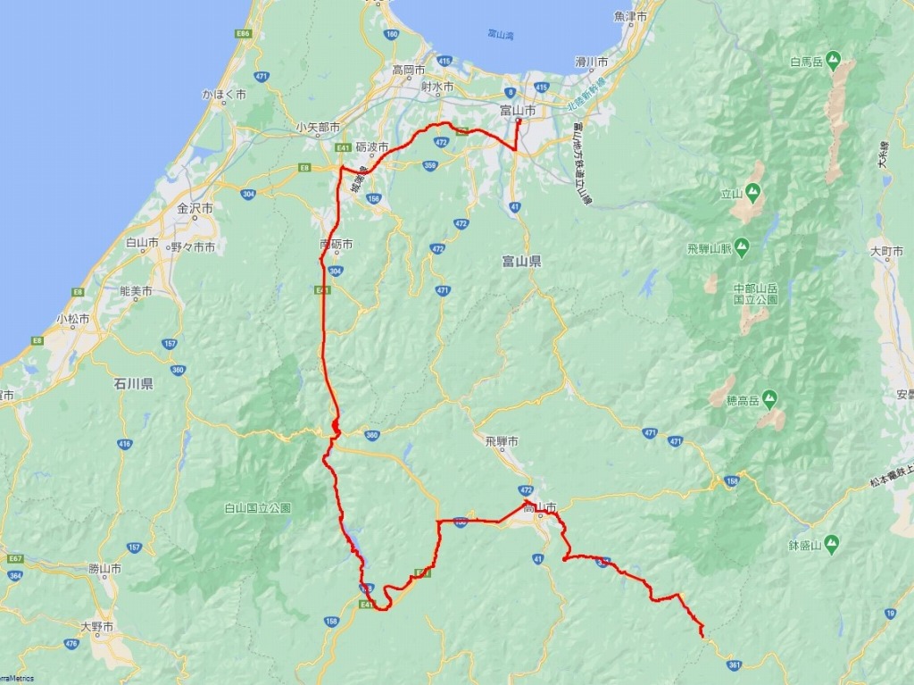 | 1日目午後の道程:開田高原〜高山〜白川〜富山: 211.47 km | |