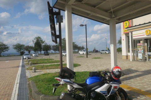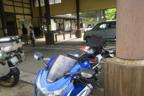 15:00 雨宿り 雨は降り続いています。 道の駅の屋根がある障害者用の駐車スペースの端っこにバイクを停めて、雨宿り。 辺りは少し明るくなってきましたが、雨止むかな。 |