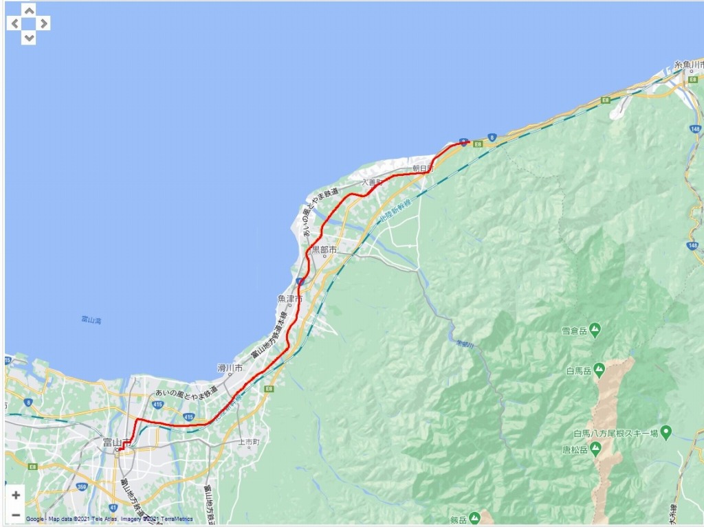 | 道程:富山市内〜朝日町(栄食堂):55.17km | |