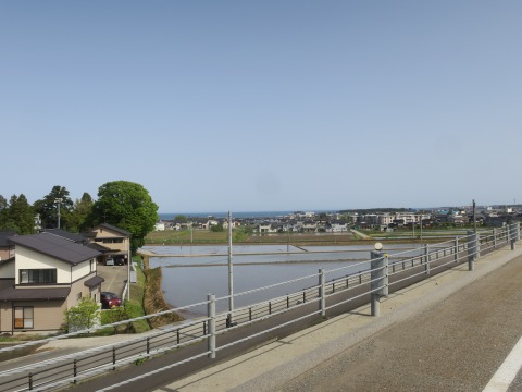 8:26 日本海が 見えてきました。 そう言えば、日本海側にきたのに昨日は日本海見てませんでしたね。 今も遠くにしか見えないけど・・・・。 ホテルを出発して、小一時間走りましたが、まだ着かない? どこまで行くんでしょうね? 東進を続けます。 |