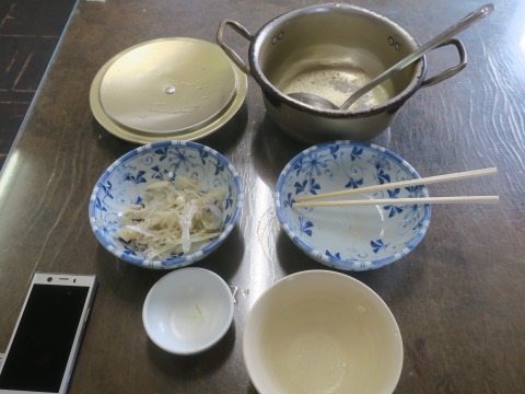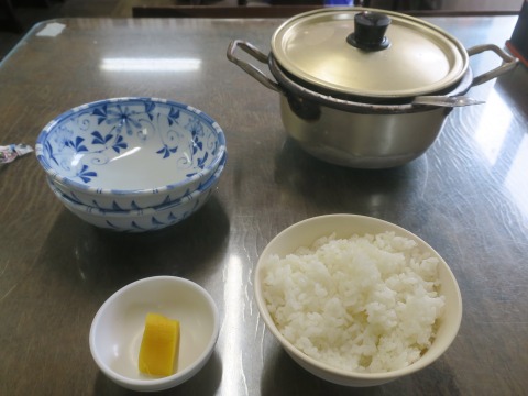 9:05 料理がきました 10分弱ほどで、運ばれてきました。 テーブルの上にドン! たら汁の入ったアルマイトの鍋が置かれます。 取り皿は2つ。 お一人様ですけど・・・。 ご飯は、どんぶり飯。 豪快。(笑) |