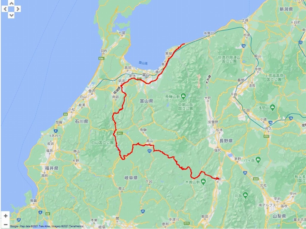 2日目朝食後の道程:朝日町〜砺波〜相倉の合掌造り集落(前半)〜荘川〜高山〜開田高原〜伊那市:344.05 km