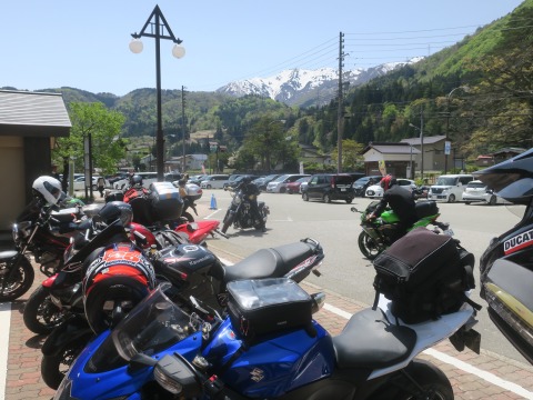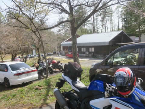 御嶽山の写真を写した九蔵峠(くぞうとうげ)付近からバイクを東進させていると、左手の駐車場にクルマがいっぱい、バイクもいっぱい駐まっています。