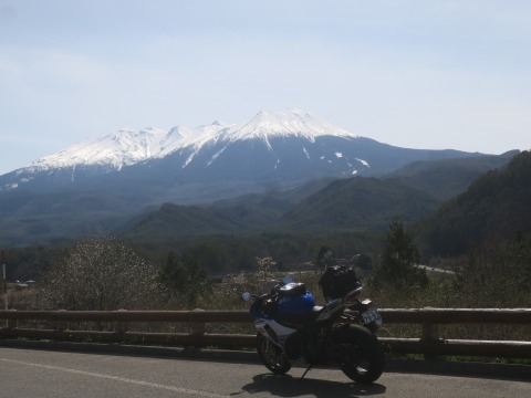 途中、御嶽山が見える開けた場所に出たので、道路が広くなったところにバイクを駐めて写真を一枚。