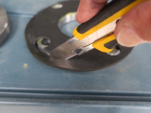 15:32 切る カッターナイフではみ出した部分を切っていきます。 フランジの規格が5K、パッキンが 10K。 パッキンが同じ規格の5K用だったら、こんな手間は要らなかった。(汗) |