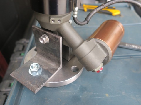 15:54 リザーバータンクが で、クルッと反対側に回すと・・・・。 (-_-;) あれ〜〜〜ぇ。 リザーバータンクが邪魔じゃん。 長ネジを通す場所に、リザーバータンクが鎮座してます。 (>_<) これじゃ、上下のフランジ間で長ネジが通せない。 まずい! 企画倒れか。 自分の頭の中で考えられるのが2次元までだった。(爆) 実際 3次元だと、リザーバタンクが邪魔だった。 |