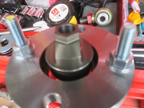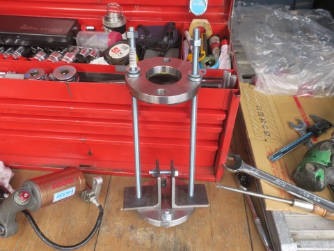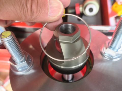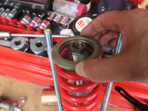 15:30 組み付け スプリングの組み付けは逆の手順で。 スプリングを付けて、それに台座を付けたら、フランジを取り付けナットを交互に締めていって、スプリングを圧縮。 Cリングを取り付けます。 |