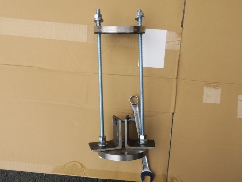 15:38 自作の 自作のスプリング コンプレッサー。 前回まで、自作の工程を3回に渡ってしつこく記事にしていたヤツだ。 (>_<) 今回、スプリングを交換するのに使うと思って買った22のコンビネーションレンチ。 結局、使う必要がなくて・・・・・。 写真を撮るためのスプリング コンプレッサーの転がり止めに成り下がってしまった。 (笑) |