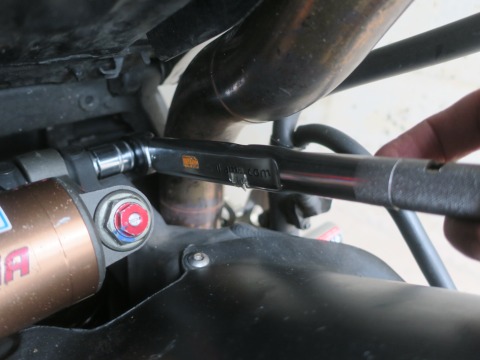 16:32 狭い サスペンションを外すときにも書いたけど、サスペンションは上下の2本のボルトで止まっているだけなので、作業は簡単。 ボルト・ナットを取り付けたら、最後はトルク レンチで。 ただ、狭いところなので、トルクレンチのラチェットが1回分送れる位のスペースしかない。 結構、めんどう。(笑) |