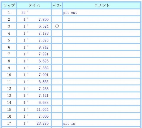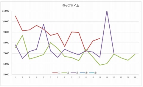 午前中3本 午前中3本のラップチャート。 基本 右肩下がりで、徐々にペースが上がる素人タイプ。(笑) 特に1本目は、完熟走行で徐々にペースが上がってますね。 3本目の最後のヘビでビックリはご愛敬だ。 午前中3本走って、ベストは2本目で 5秒885 でした。 |