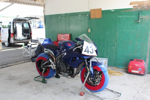 8:10 走行準備を ピットを確保したら、バイクを下ろして、走行の準備を始めます。 走行開始の時間は、9時からですが、ちょっと時間が足らない。 タイヤ ウォーマーをセットしての1時間じゃ走行の準備はちょっと厳しいです。 まあ、走行は12時〜1時の昼休みを挟んで4時までなので、時間はたっぷりあります。 焦らずに準備します。 |