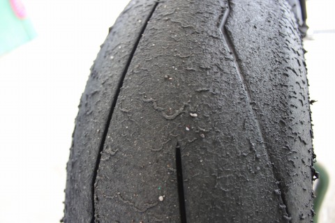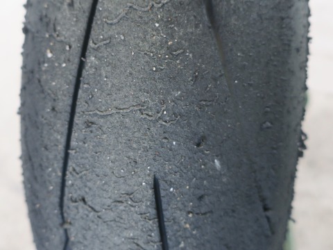 12:20 終わり 走行後のリヤタイヤ。 終わったね。 溝が無くなってる部分が出来てきてる。 午後の走行前に交換することにしましょう。 |