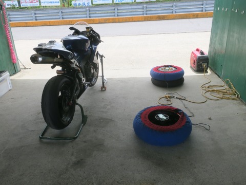 8:39 タイヤを暖める バイクを下ろしたり、工具を下ろしたり。 タイヤのエアーチェックした後、タイヤ ウォーマーを巻いて、暖め開始。 9時から走れますが、1時間くらいは暖めたいですね。 タイヤを暖めている間に、サスペンションのセッティングとかをチェック。 |