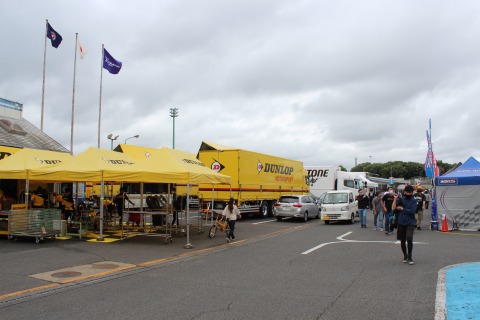 9:44 1ヘアに移動 9時45分から、午前中最後になるウォーミングアップ走行でST600クラスが走ります。 とりあえず、1ヘアピンの観客席に移動します。 途中にはDUNLOPとBRIDGE STONEのタイヤサービスの大きなトラック群。 タイヤくれないかしら。(笑) |