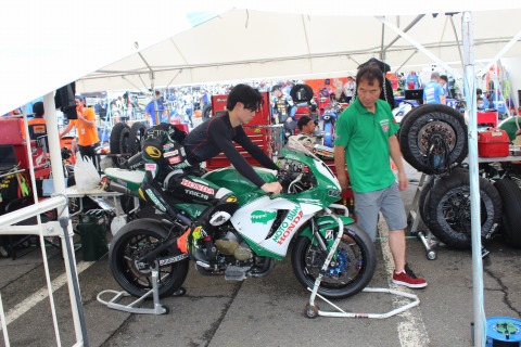 10:37 テント村に ST600クラスのフリー走行が終わり、パドックにあるMOTO BUMのテントに。 メカの清水さんにご挨拶。&去年 GSX-Rのフロント フォークのオーバーホールをしてもらったお礼おば。 写真に写っている#15のCBR600RRは清水メカが担当している鈴木光来選手のバイク。 全部の部品がピカピカじゃ。 自分のとは大違い。(笑) |