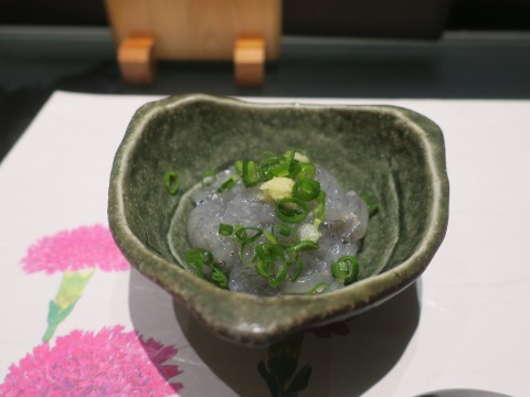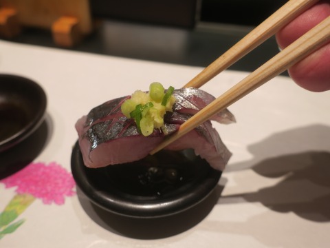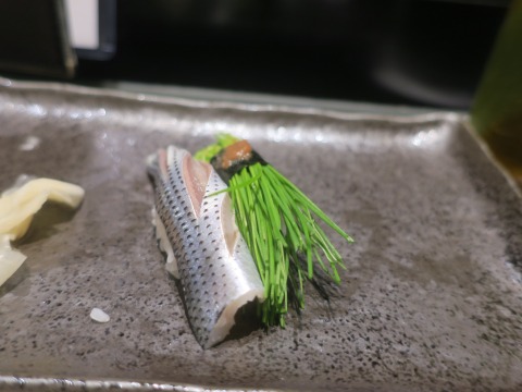 19:32 続く おまかせの握りに、芽ネギを入れてもらいました。 芽ネギとコハダ。 酢で浅く締められたコハダは、魚の旨みが楽しめて、美味しいです。 サッパリとした芽ネギは、口直しにぴったり。 |