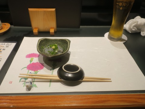 17:49 お通し 知り合いのKさんも到着しました。 Kさんは顔出しNGですので、ご了解を。 二人そろったところで、お通しが供されました。 |