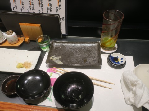 19:18 戻る イカをつまみに日本酒をいただいたので、緑茶割りに戻ります。 日本酒は2合でガマンガマン。(笑) それでは、ラストオーダーの時間が迫ってきましたので、握ってもらうことにします。 |