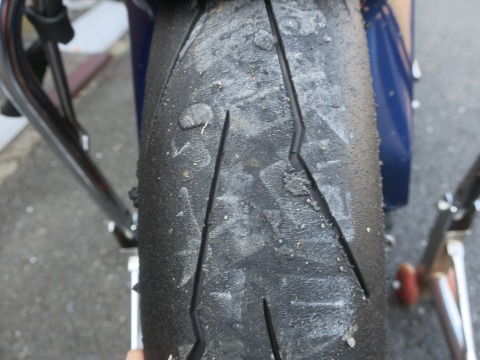 16:26 これまでの これまで履いていたタイヤ。 フロント側はまだ溝がありますが、リヤタイヤと同じタイミングで交換します。 |