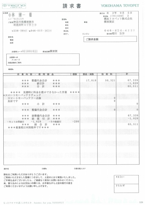 車検内容は 車検費用は全部で 10万円ちょっと。 ディーラーだから安くはないね。 標準価格? 標準的な整備内容にプラスして、アドブルーを補充。 エンジンオイルは前回交換してから2,000 kmしか走ってないけど、フィルターを交換したかったのオイルも交換しちゃいました。 それにエアコンのフィルターもね。 以上で、今年も車検終了。 4ナンバーで毎年車検なので、これで1年だけ乗ることができます。 |