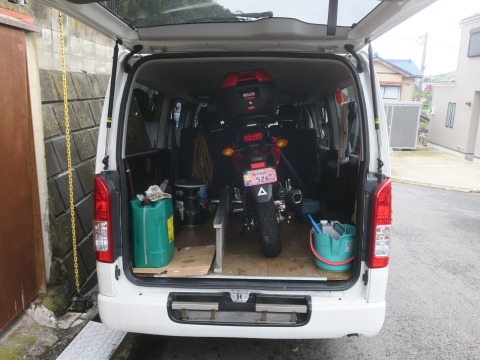 9:49 後ろには 毎度の様に、リヤの荷室にGROMを積んで。 ハイエースはディーラーに預けてくるので、帰りはGROMで戻ってきます。 朝方まで雨が降っていたので路面にまだウエットパッチが残っていますが、とりあえず雨は止みました。 雨の中、バイクを乗らずに済んで、助かりました。 それでは、出掛けますか。 |