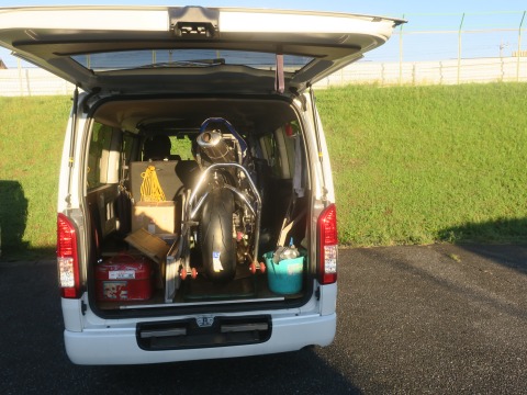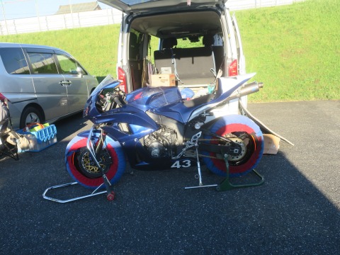6:35 走行の準備 ハイエースを駐める場所が決まったら、走行準備。 まずは、タイヤのエアーをチェックしてタイヤ ウォーマーをセット。 今日の1本目は8時から。 タイヤを暖める時間は1時間半くらいありますね。 やっぱり、1時間半は暖めたいところです。 |