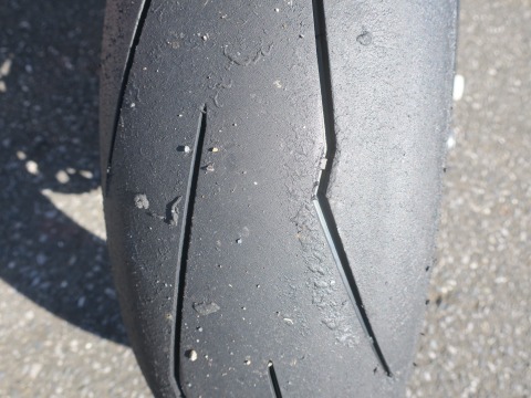 8:33 走行後の 1本目の走行が終わって、ハイエースのところに戻ってきました。 3箇月のブランクは思っていたより大きかったですね。 冬場からのシーズンインは、ボチボチ完熟走行から走り始めればいいけど、この時期だとまわりのペースが高いですからね。 慣れ感のギャップを感じます。 走行後のリヤタイヤ。 きれいなもんですね。 ツーリングをしたみたいです。 (-_-;) ファイナルをロングにしたんでね。 その分タイヤに伝わるトルクは減っているわけで。 タイムを上げようと思ったら、コーナーリング区間のタイムを縮めないとです。 ロングになっている分、直線の加速はその分鈍っている訳ですから。 コーナーリング中のタイムを縮めるのは、コーナー間のスピードを上げる。 以前より、バイクの寝ているのが少なくなっているのは解っているので。 もうちょっと頑張らないと、ですね。 それでは、2本目の走行の準備をします。 (つづく) |