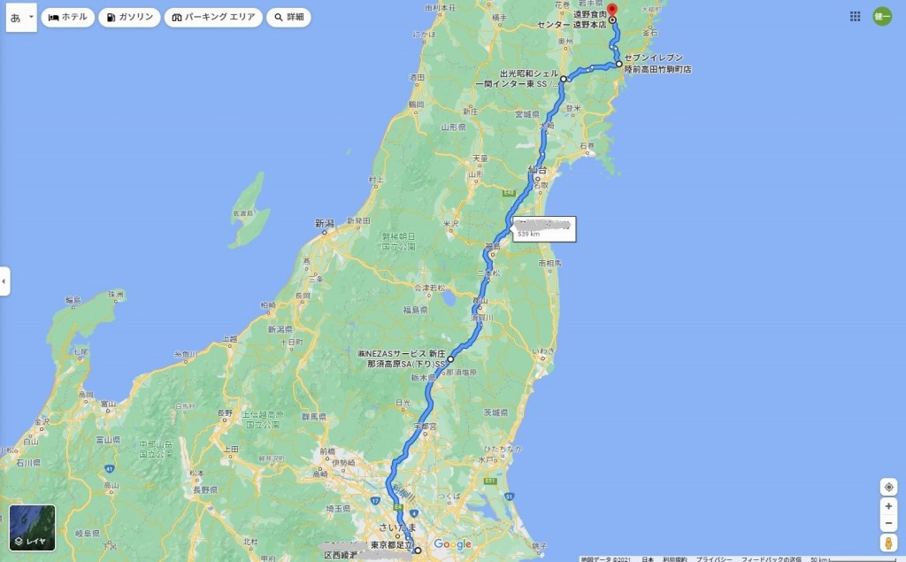 | 9月24日(金)前半の道程: 社宅〜一ノ関〜陸前高田〜遠野 :539km (GPSロガーの調子が悪くデータが取れなかったので、google mapで作成) |