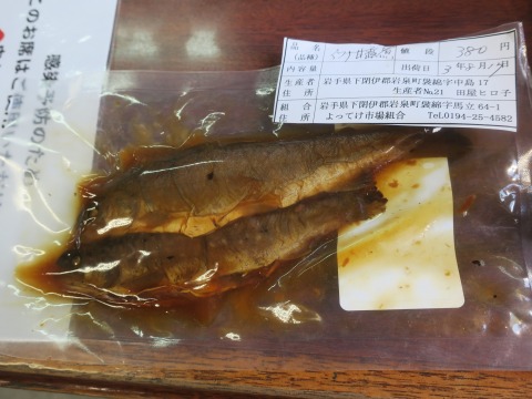 12:04 イワナ甘露煮 食事が出来るのを待っている間、産直市場の方を眺めていたら、これを買っている人がいました。 「何々? イワナの甘露煮」 美味しそう。 地元手作り。 自分のお土産に1個買って帰ることにします。 |